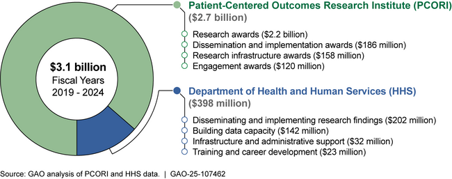 Comparative clinical effectiveness research evaluates and compares the health outcomes of two or more medical treatments, services, or items. In 2010, Congress authorized the establishment of the Patient-Centered Outcomes Research Institute (PCORI) to conduct this research and improve its quality and relevance, and directed the Department of Health and Human Services (HHS) to publicly disseminate and help incorporate these research findings into clinical practice. PCORI and HHS obligated a total of $3.1 billion for fiscal years 2019 through 2024.