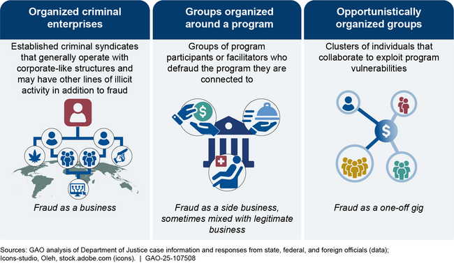 Organized criminal enterprises involve established criminal syndicates that may have other lines of illicit activity. Groups organized around a program may involve program participants and facilitators who conspire to defraud the program they are connected to. Opportunistically organized groups involve clusters of individuals who come together as opportunities for fraud arise.