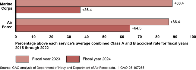 The Marine Corps and Air Force had higher rates of the most serious accidents in the last 2 fiscal years (2023 and 2024) with its Osprey aircraft compared with the average serious accident rate for the previous 8 years, based on available Department of Defense (DOD) data. In fiscal years 2023 and 2024, 18 serious, non-combat accidents occured involving death; permanent disability; extensive hospitalization; property damage of $600,000 or more; or a destroyed aircraft. Rates of serious accidents were between 36 percent and 88 percent higher than each service's average rate for the prior 8 fiscal years.