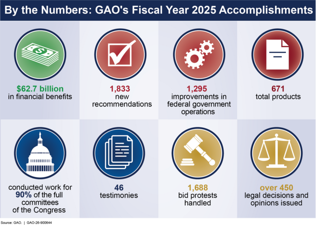GAO's work yielded $62.7 billion in financial benefits for the federal government in FY 2025.