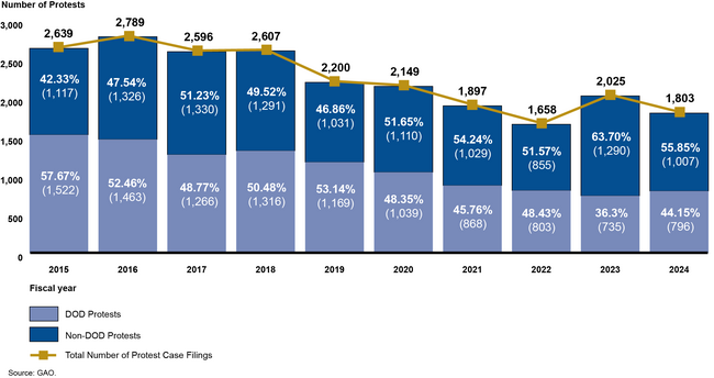 GAO's bid protest statistics reflect a general downward trend in the number of protests. As reflected in Figure 1 below, between Fiscal Years 2015 and 2024, GAO has seen an approximate decline of 32 percent in all protest filings, and an approximate decline of 48 percent in protests challenging procurements conducted by DOD. Additionally, during the past 10 fiscal years, the percentage of GAO protests challenging DOD procurements as compared to all protest filings has declined by approximately 13.5 percent. Over the past five fiscal years, DOD protests, on average, have accounted for approximately 44.6 percent of GAO's total cases.