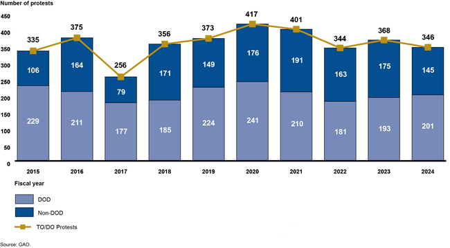 In addition to examining the overall trends in protest filings, we also examined the number of protests challenging DOD procurements relative to the number of procurements conducted by DOD. Our analysis was informed by the previous analysis conducted by the RAND Corporation in 2018 in response to the requirements of Section 885 of the FY2017 NDAA, which directed the Secretary of Defense to contract with an independent research entity to conduct a study of DOD protests. The 2018 RAND study, using protest data from Fiscal Years 2008-2016, calculated that less than 0.3 percent of total DOD contracts were protested at GAO, or, alternatively, that approximately 3 protests per billion dollars spent were filed at GAO.[27] Our review, using up-to-date DOD procurement data and the lower bid protest filing statistics for Fiscal Years 2015-2024, confirms that protests challenging DOD contract awards remain rare, amounting to at most approximately 1.5 percent of procurements being protested.[28]