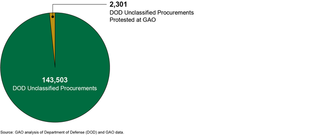 In preparing our response, DOD's Defense Pricing, Contracting, and Acquisition Policy office provided data from the Federal Procurement Data System-Next Generation (FPDS-NG) regarding the number and value of DOD unclassified procurements, excluding orders (e.g., task or delivery orders under indefinite-delivery, indefinite-quantity contracts pursuant to Federal Acquisition Regulation (FAR) subpart 16.5). DOD excluded orders to avoid double-counting the value of both the maximum ceiling for an order contract vehicle and the value of the orders placed thereunder. With respect to the number of bid protests filed at GAO, DOD indicated it does not centrally collect this data. Accordingly, GAO used our own internal case tracking system to assemble data about the number of DOD bid protests filed in our forum. To provide the most direct comparison point for the FPDS-NG procurement data, GAO identified the number of primary bid protests[29] of DOD unclassified procurements, also excluding orders. Based on the FPDS-NG procurement data provided by DOD and GAO's internal case tracking data, during fiscal years 2020 through 2024 DOD conducted 143,503 unclassified procurements (excluding orders), of which 2,301, or approximately 1.58 percent, were protested at GAO.[30]