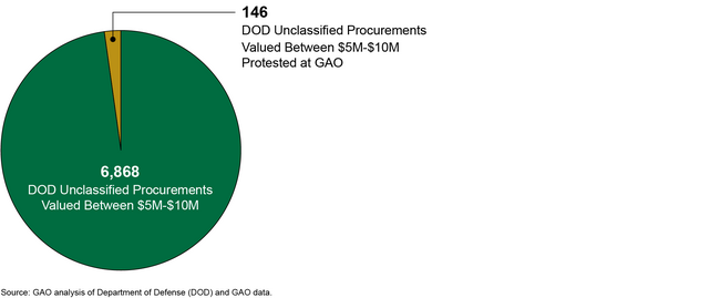 As DOD does not centrally track bid protests, DOD officials were unable to provide the exact dollar value of each protested procurement, but DOD officials were able to provide approximate numbers of total DOD procurements by dollar ranges. Internally, GAO tracks the value of each protested procurement by dollar range, and we were able to compare the number of protested procurements with the total number of DOD procurements by these dollar ranges. For example, during fiscal years 2020 through 2024 DOD conducted 6,868 unclassified procurements (excluding orders) valued between $5 million and $10 million, of which 146, or approximately 2.13 percent, were protested at GAO.