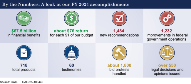 In fiscal year 2024, GAO's work yielded $67.5 billion in financial benefits, a return of about $76 for every dollar invested in GAO. Our average return on investment for the past 6 years is $123 to $1.