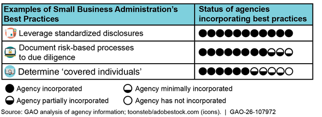 In March 2023, the Small Business Administration (SBA) established 12 best practices to help participating agencies manage risks posed by small business applicants in their Small Business Innovation Research (SBIR) and Small Business Technology Transfer (STTR) programs. GAO found that participating agencies and selected components have incorporated some best practices in their due diligence efforts, but gaps remain. For example, as of August 2025 all agencies had incorporated three of the 12 best practices, such as leveraging standardized foreign affiliation disclosures to capture consistent information. Most agencies incorporated additional practices, such as documenting a risk-based approach to their due diligence processes, and some incorporated practices such as determining “covered individuals” required to submit disclosures (see figure). The SBIR and STTR Extension Act of 2022 (Extension Act) requires participating agencies to incorporate the applicable best practices in their due diligence programs to the extent practicable. Doing so may improve agencies’ ability to manage potential foreign risks.