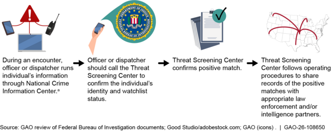 Nonfederal law enforcement officers query encountered individuals against the terrorist watchlist during routine police interactions, such as traffic stops. After encountering a potentially terrorist watchlisted individual, nonfederal law enforcement officers receive instructions, via the National Crime Information Center (NCIC), to contact the Federal Bureau of Investigation’s (FBI) Threat Screening Center to determine whether the individual is a positive or negative match to the terrorist watchlist.