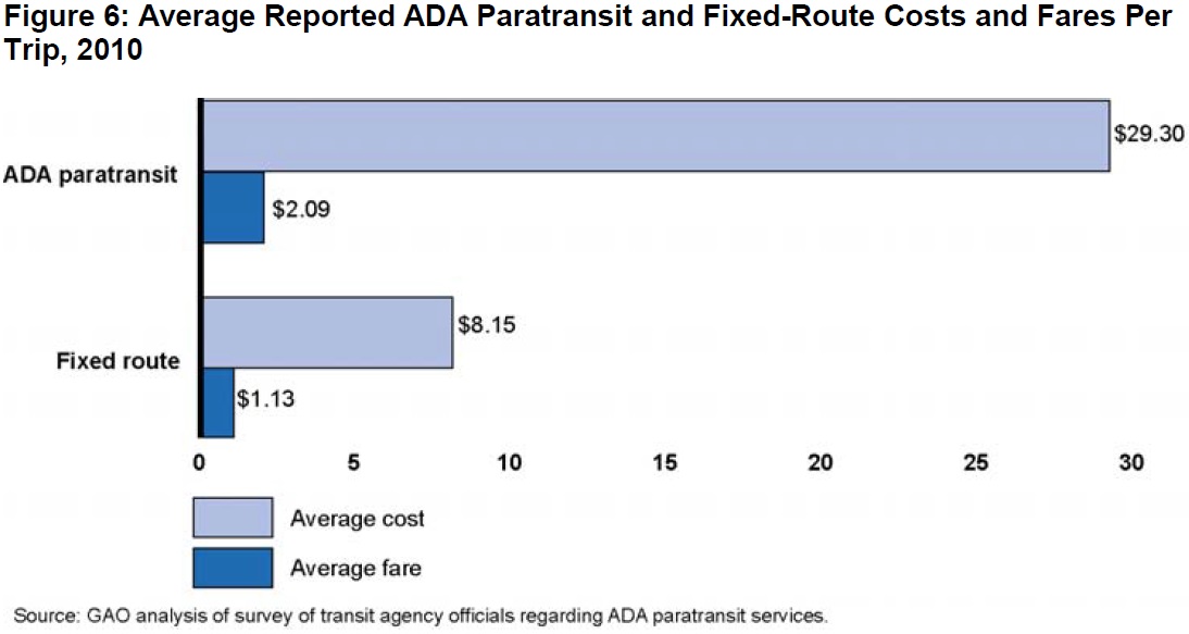 Moreover, the average paratransit fare of $2 is far below the average cost of providing the trip. This is because the ADA requirements for paratransit service limits the fare that may be charged.