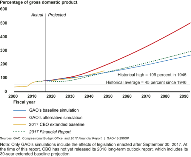 The 2017 Financial Report, CBO, and GAO projections all show that, without policy changes, debt will continue to grow faster than the economy.