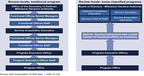 To perform this work, GAO examined the levels of review and information requirements that are part of DOD's process. GAO surveyed 24 program managers and 40 other DOD officials on the value and the time to complete milestone documentation. For 15 program offices, we gathered data on the time to complete the entire milestone decision process. GAO discussed with DOD officials the factors that lead to inefficiencies. GAO also examined practices used by some classified DOD programs and five commercial firms generally recognized as leaders in product development.