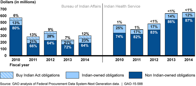 Use of the Buy Indian Act comprises a small percentage of the two agencies' annual contract obligations. However, these agencies also award contracts to Indian-owned firms using other authorities, thus increasing the percentage of obligations awarded to Indian-owned firms.