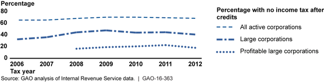 To provide an update, GAO was asked to assess the extent to which U.S. corporations pay federal income tax and the percentage that had no federal income tax liability. In this report, GAO estimates (1) the percentage of all and large corporations that had no federal income tax liability and (2) average ETRs based on financial statement reporting and tax reporting. To conduct this work, GAO reviewed economic literature, analyzed IRS data for tax years 2006 to 2012 (the most recent data available), including the financial and tax information that large corporations report on Schedule M-3, and interviewed Internal Revenue Service (IRS) officials and subject matter experts.