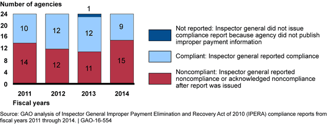 For fiscal year 2014, 15 of the 24 Chief Financial Officers Act (CFO Act) agency inspectors general (IG) determined that their agencies did not comply with criteria in the Improper Payments Elimination and Recovery Act of 2010 (IPERA). This is the largest number of CFO Act agencies reported as noncompliant under IPERA since the requirement for IGs to report on their agencies' compliance was implemented in fiscal year 2011, and represents an increase of 4 agencies from fiscal year 2013. In fiscal year 2014, IGs reported 38 programs accounting for $100.6 billion in estimated improper payments as responsible for instances of noncompliance. Agency noncompliance for fiscal year 2014 was largely due to agencies failing to meet improper payment reduction targets or to report improper payment error rates at less than 10 percent for all programs. If the 5 agencies with programs exceeding 10 percent error rates had reported error rates under the threshold set in IPERA, the government-wide improper payment estimate would have been $23.1 billion, or 18.6 percent, lower.