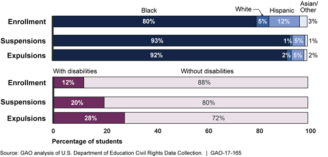 Discipline rates (out-of-school suspension and expulsion rates) at District of Columbia (D.C.) charter schools dropped from school years 2011-12 through 2013-14 (the most recent years of national Department of Education data available). However, these rates remained about double the rates of charter schools nationally and slightly higher than D.C. traditional public schools and were also disproportionately high for some student groups and schools. Specifically, during this period, suspension rates in D.C. charter schools dropped from about 16 percent of all students to about 13 percent, and expulsions, which were relatively rare, went down by about a half percent, according to GAO's analysis. However, D.C. Black students and students with disabilities were disproportionately suspended and expelled. For example, Black students represented 80 percent of students in D.C. charter schools, but 93 percent of those suspended and 92 percent of those expelled. Further, 16 of D.C.'s 105 charter schools suspended over a fifth of their students over the course of school year 2015-16, according to D.C. data.