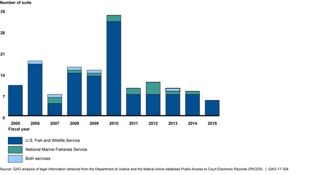 GAO found that plaintiffs filed 141 deadline suits against the U.S. Fish and Wildlife Service (FWS) and National Marine Fisheries Service (NMFS) for allegedly failing to take actions within statutory deadlines under Section 4 of the Endangered Species Act (ESA) during fiscal years 2005 through 2015 (see figure). Section 4 contains mandatory deadlines for such actions as making findings on petitions to list or delist species as threatened or endangered. The suits involved 1,441 species and cited a range of Section 4 actions, but most suits were related to missed deadlines for issuing findings on petitions to list species.