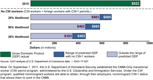 In 2015, foreign workers made up more than half of CNMI's workforce. The Department of Homeland Security aims to eliminate all work permits (CW-1 permits) that allow foreign nationals to work in CNMI by the end of 2019. However, our economic analysis estimated that without foreign workers, CNMI's 2015 gross domestic product would have been reduced by 26-62%.