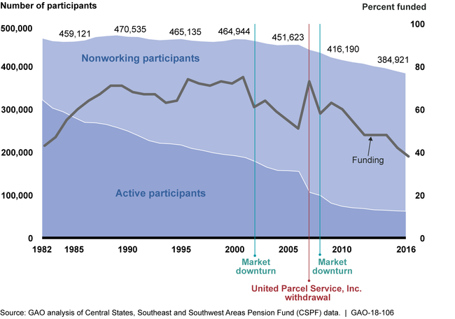 Stakeholders GAO interviewed identified numerous factors that contributed to CSPF's financial condition. For example, stakeholders stated that changes within the trucking industry as well as a decline in union membership contributed to CSPF's inability to maintain a healthy contribution base. CSPF's active participants made up about 69 percent of all participants in 1982, but accounted for only 16 percent in 2016. The most dramatic change in active participants occurred in 2007 when the United Parcel Service, Inc. (UPS) withdrew from the plan. At that time, UPS accounted for about 30 percent of the plan's active participants (i.e. workers). In addition, the market declines of 2001 to 2002 and 2008 had a significant negative impact on the plan's long-term investment performance. Stakeholders noted that while each individual factor contributed to CSPF's critical financial condition, the interrelated nature of the factors also had a cumulative effect on the plan's financial condition.