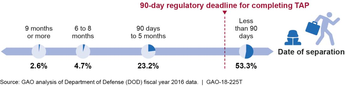 In fiscal year 2016, DOD met its goal of 85 percent of active duty servicemembers (i.e., not members of the National Guard and Reserves) who met VOW Act requirements and attained Career Readiness Standards, according to GAO's analysis. In order to complete TAP, servicemembers generally must participate in three required courses and have their Career Readiness Standards verified by a unit commander or designee. In addition, commanders or their designee must ensure that servicemembers who do not meet these standards are referred to staff of partner agencies, such as the Department of Labor and Department of Veterans Affairs, for additional services, commonly called a "warm handover." However, fewer than half of all eligible servicemembers completed TAP on time--90 days or more before separation.
