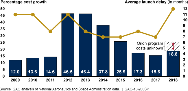 The average launch delay was 12 months—the most we've ever reported. However, the extent of cost growth for the portfolio of projects is unknown because NASA doesn't have a current cost estimate for the Orion crew vehicle, one of its most expensive projects.