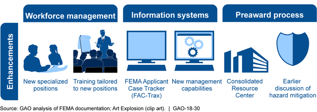 GAO was asked to assess the redesigned PA program. This report examines, among other things, the extent to which FEMA's new delivery model addresses (1) past workforce management challenges and assesses future workforce needs; and (2) past information sharing challenges and key IT management controls. GAO reviewed FEMA policy, strategy, and implementation documents; interviewed FEMA and state officials, PA program applicants, and other stakeholders; and observed implementation of the new model at one test location following Hurricane Matthew in 2016.