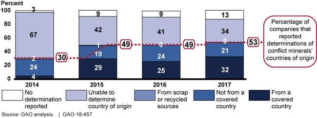 GAO's review of companies' conflict minerals disclosures filed with the U.S. Securities and Exchange Commission (SEC) in 2017 found that, in general, they were similar to disclosures filed in the prior 2 years. In 2017, 1,165 companies filed conflict minerals disclosures—about the same as in 2016 and 2015. Percentages of companies reporting country-of-origin inquiries in 2017 were also similar to the percentages from those 2 prior years. As a result of the inquiries they conducted, an estimated 53 percent of companies reported in 2017 whether the conflict minerals in their products came from the Democratic Republic of the Congo (DRC) and adjoining countries—similar to the estimated 49 percent in 2016 and 2015 but significantly higher than the estimate of 30 percent in 2014 (see figure). In their 2017 disclosure reports, many companies described actions they took to improve data collection processes, and most companies indicated some challenges in determining the country of origin.