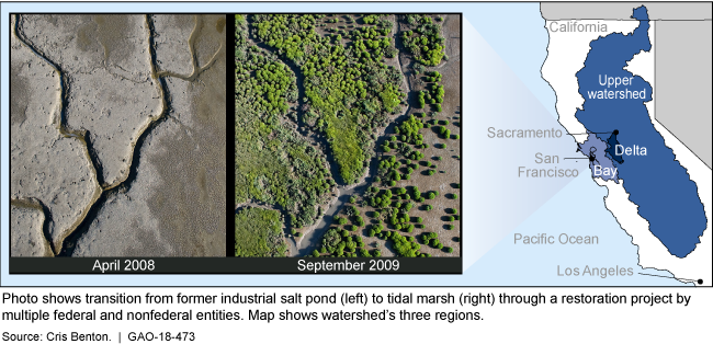 The San Francisco Bay Delta watershed—which drains a vast area of California from the Sierra Nevada Mountains to the Pacific Ocean—supplies drinking water for 25 million people and provides irrigation for about half the nation's fruit and vegetable production. Decades of development and agriculture have led to large reductions in water quality and supply, natural flood protection, and habitats across the watershed's three major regions: the Bay, the Delta, and the upper watershed. Federal entities have been working with nonfederal entities for decades to protect and restore the watershed. GAO was asked to review restoration efforts in the watershed.