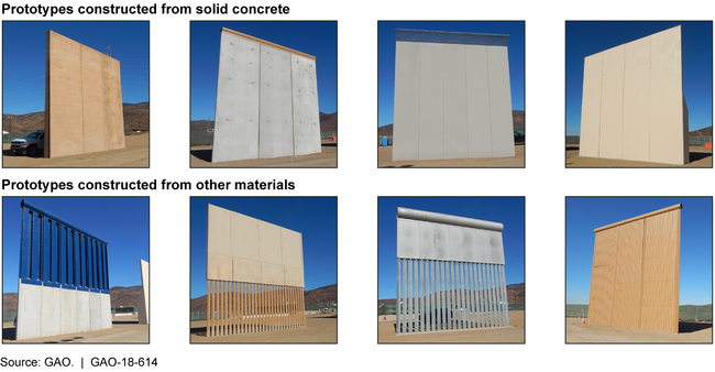 In March 2017, U.S. Customs and Border Protection (CBP), within the Department of Homeland Security (DHS), issued two requests for proposals (RFP) for physical barrier prototype designs for the southwest border. One RFP was for prototypes made of reinforced concrete, the other was for prototypes made of other materials. CBP subsequently issued task orders, under contracts awarded to six companies, to design and construct eight prototypes, pictured below. From October to December 2017, CBP tested the prototypes, using a range of methods to attempt to climb and breach them. Based on the results, CBP identified design attributes it can use to customize future barrier designs for specific locations, depending on the terrain and other factors.