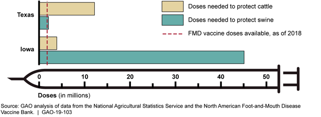 Foot-and-Mouth Disease (FMD) Vaccine Doses Needed to Protect Cattle and Swine in Texas and Iowa, Compared with Vaccine Doses Available, 2018
