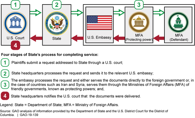 The Department of State (State) notifies sovereign defendants of court proceedings under the Foreign Sovereign Immunities Act (FSIA) in a four stage process that has taken on average about 5 months to complete. State headquarters has overall responsibility for delivering legal documents but U.S. embassies and foreign governments play key roles as well. From 2007 through 2017, State completed 229 requests for delivery of legal documents in an average of about 5 months, but about 28 percent of the requests took longer than 6 months and 7 requests took more than a year. Slow delivery could adversely affect a plaintiff's ability to obtain compensation from a special victims' fund that Congress set up in 2015.