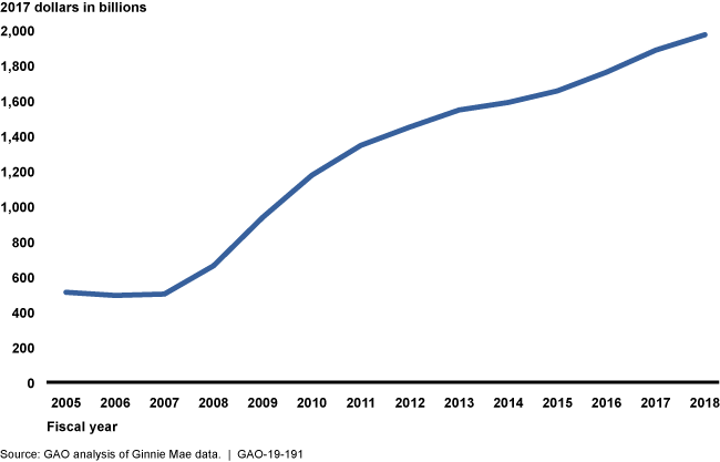 The amount of mortgage-backed securities (MBS) that the Government National Mortgage Association (Ginnie Mae) guaranteed rose from $500 billion to $2 trillion in fiscal years 2007–2018—exposing it to a greater risk of loss. From 2011 to 2018, the majority of institutions issuing Ginnie Mae-guaranteed MBS (issuers) shifted from banks to nonbanks, such as mortgage lenders. Unlike banks, nonbank issuers generally are not consistently subject to comprehensive federal safety and soundness standards.