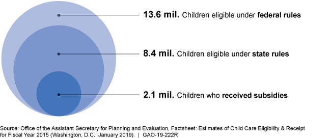 An estimated one-quarter of children eligible for child care subsidies under state eligibility rules received them (2.1 million of the 8.4 million children in an average month estimated to be eligible under state rules), according to the Department of Health and Human Services' (HHS) analysis of data from fiscal year 2015, the most recent year for which such analysis is available. This represented 15 percent of all children estimated to be eligible under federal rules, as generally, fewer families qualify for subsidies under state eligibility rules than under federal eligibility rules since most states use flexibility provided by HHS to set their income eligibility limits below the federal maximum.