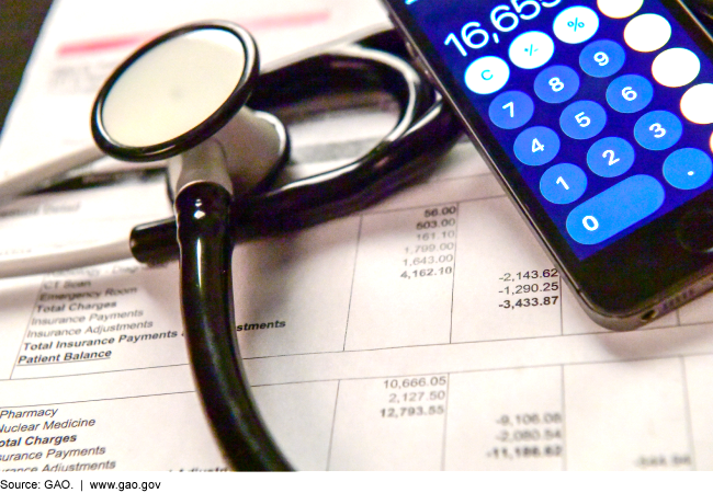 This is a photo of a stethoscope and calculator resting on a medical bill.