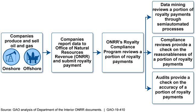 The Department of the Interior's (Interior) Office of Natural Resources Revenue (ONRR) reported that it met its annual performance goals for its royalty compliance program in 6 of the 8 years from fiscal years 2010 through 2017. Under this program, ONRR conducts three levels of compliance activities—audits, compliance reviews, and data mining—to help ensure that oil and gas royalty payments submitted by companies that produce oil and gas from federal leases are accurate and comply with federal laws and regulations (see figure). Specifically, GAO's analysis of Interior's annual budget justifications for fiscal years 2010 through 2017 found that ONRR reported meeting its compliance goals for 6 of the 8 fiscal years. According to ONRR officials, ONRR did not report meeting its compliance goals for 2 years because of a shift in the agency's goals that created a short-term misalignment of planned work and available resources. ONRR's fiscal year 2017 goals for its compliance program were (1) to obtain a return of $2 of additional royalties for every dollar spent on compliance activities and (2) to collect a defined amount of additional royalties. ONRR's compliance goals generally aligned with the agency's requirement that resources should not be expended without an expected return. However, these goals may not align with the agency's mission to collect, account for, and verify royalty payments and other statutory requirements because the goals do not address accuracy—or the extent to which its compliance work is covering, for example, royalty payments. By establishing a goal that addresses accuracy, for example, by covering a portion of royalty payments with its compliance activities, ONRR could increase the extent to which it had reasonable assurance that its compliance program is fully accounting for federal oil and gas royalty payments.