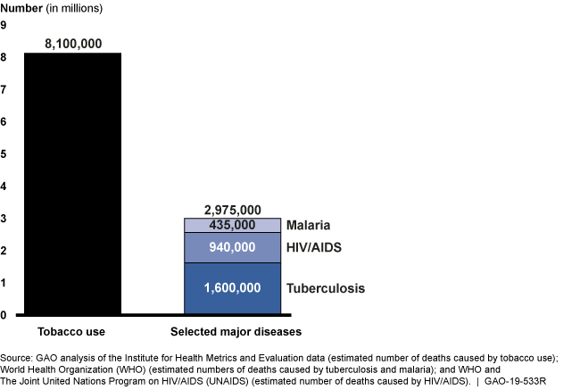 Bar graph showing more than 8 million deaths by tobacco compared to around 3 million for malaria, HIV/AIDS and TB combined