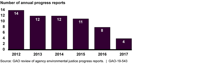 Agencies' progress toward environmental justice is difficult to gauge, however, because most do not have updated strategic plans and have not reported annually on their progress or developed methods to assess progress. As they agreed to do in a 2011 Memorandum of Understanding (MOU), most of the agencies developed environmental justice strategic plans, but only six have updated them more recently. Few agencies have measures or methods for assessing progress, and the working group has not provided guidance to help agencies with such assessments. The number of agencies issuing annual progress reports has declined (see fig.). Updated strategic plans and annual progress reports, along with guidance on performance measures and methods, would help agencies provide essential information to assess their progress.