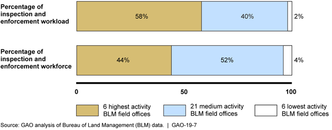 Based on GAO's analysis of Bureau of Land Management (BLM) data, the distribution of BLM's oil and gas Inspection and Enforcement program's workload and workforce showed an imbalance among BLM's 33 field offices in fiscal years 2012 through 2016. GAO analyzed BLM data on the overall percentage of the workload and workforce distributed at each field office (i.e., activity level) and grouped similar activity level field offices together into highest, medium and lowest activity categories. GAO found that the program distributed the majority of its workload to 6 highest activity offices and distributed the majority of the workforce to 21 medium activity offices (see fig.). Based on GAO's review of BLM documentation and interviews with agency officials, BLM took both short- and long-term actions in fiscal years 2012 through 2016 to address this imbalance, such as temporarily re-assigning inspectors from some medium activity offices to some of the highest activity offices.