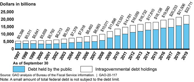 From fiscal year 1997, the first year of audit, through September 30, 2019, total federal debt managed by Fiscal Service has increased from $5.4 trillion to $22.7 trillion, and the debt limit has been raised 19 times.
