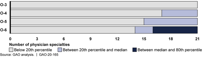 In 2017, cash compensation for military physicians and dentists in most of the 27 medical and dental specialties GAO reviewed was generally less than the median compensation of private sector civilians, but the Department of Defense (DOD) provides substantial deferred and noncash benefits, such as retirement pensions and tuition-free education, whose value to servicemembers is difficult to determine. GAO found that for 21 of the 27 physician and dental specialties, the maximum cash compensation was less than the private sector civilian median within four officer pay grades (O-3 to O-6) (see figure for number of physician specialties by pay grade). Moreover, cash compensation for military physicians and dentists was less than the private sector civilian median at key retention points, such as after physicians and dentists fulfill their initial active-duty service obligations.