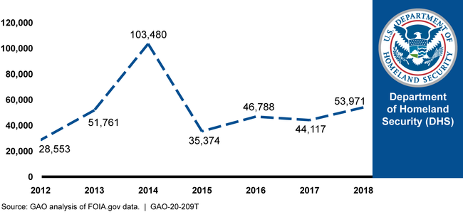 DHS’s backlog of unfulfilled FOIA requests almost doubled between 2012 and 2018. But DHS doesn’t have a plan to address this backlog of more than 50,000 requests—which means it will likely continue to struggle with backlogs.