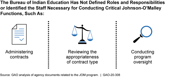 | Bureau of Indian Education | The Director of the Bureau of Indian Education should clearly define the roles and responsibilities and identify the staff necessary for conducting critical JOM functions, including administering contracts, reviewing the appropriateness of contract types, and overseeing those contractors that are subject to BIE oversight. (Recommendation 5) |