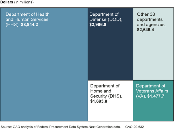 The Departments of Health and Human Services, Homeland Security, Defense, and Veterans Affairs accounted for 85% of the money awarded in contracts. About $11 billion was awarded in contracts for goods—e.g., ventilators, gowns, and N95 respirators—to treat coronavirus patients and protect health care workers. The agencies awarded about $9.4 billion in contracts without competition, often citing urgency as the reason.