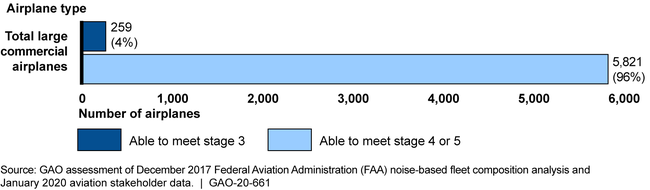 Based on Federal Aviation Administration (FAA) data and GAO estimates, most U.S. large commercial jet airplanes are certificated at the minimum required stage 3 noise standards, but nearly all of them are able to meet more stringent noise standards. Sixty-three percent of large commercial airplanes in the United States are certificated as meeting the stage 3 standards; however, 87 percent of them were manufactured with technologies that are able to meet more recent and stringent stage 4 or 5 standards as currently configured, according to FAA's 2017 analysis. By analyzing updated data from airlines and aviation manufacturers, GAO estimated that this proportion is even higher: 96 percent of large commercial airplanes are able to meet stage 4 or 5 standards (see figure). According to FAA officials and aviation stakeholders, the primary reason many large commercial airplanes certificated as stage 3 produce lower than stage 3 noise levels is because engine and airframe technology has outpaced the implementation of noise standards. More recently, some airlines have accelerated retirement of certain airplanes, some of which are certificated as stage 3, due to the decrease in travel amid the COVID-19 pandemic. For the generally smaller regional commercial jets (i.e., generally with less than 90 seats), 86 percent are able to meet stage 4 or stage 5 standards, according to manufacturers' data. With regard to general aviation (which are used for personal or corporate flights), 73 percent of the jet airplanes in that fleet are able to meet the more stringent stage 4 or 5 standards, according to manufacturers' data.