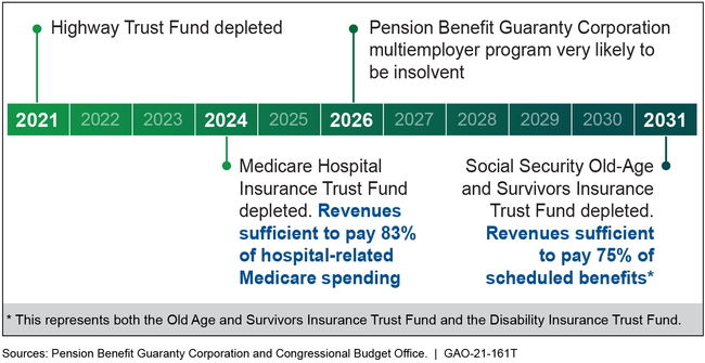 Notes: Years above may reflect either fiscal or calendar years. The Congressional Budget Office projections for the trust funds reflect the effects of COVID-19. Pension Benefit Guaranty Corporation projections do not reflect the effects of COVID-19.