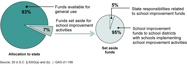 Many states use flexibilities in the Elementary and Secondary Education Act (ESEA), as amended, in identifying low-performing schools and student subgroups (e.g., students from major racial and ethnic groups and low-income students) that need support and improvement. For example, states must identify all public high schools failing to graduate at least one-third of their students. According to GAO's state plan analysis, four states used ESEA's flexibilities to set higher graduation rates (i.e., 70-86 percent) for purposes of state accountability. Similarly, while ESEA requires states to identify schools in which students in certain subgroups are consistently underperforming, 12 states assess the performance of additional student subgroups. Although states are generally required to set aside a portion of their federal education funding for school improvement activities (see figure), states have some discretion in how they allocate these funds to school districts. According to GAO's survey, 27 states use a formula to allocate funds. GAO also found that in at least 34 states, all school districts that applied for federal funds received them in school year 2018-2019, but states had discretion regarding which schools within those districts to fund and at what level.