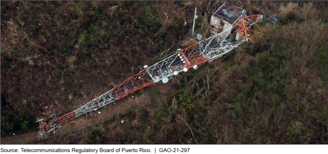 Hurricane Maria battered Puerto Rico and the U.S. Virgin Islands in 2017, causing great physical harm to residents and severely damaging the islands' critical infrastructure, including telecommunications networks (see photo). Federal agencies faced unprecedented challenges in the hurricane's aftermath that complicated efforts to address telecommunications outages. While DHS is the lead agency in federal disaster response, FCC has a supporting role related to telecommunications issues.