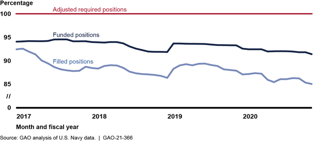 The Navy routinely assigns fewer crewmembers to its ships than its workload studies have determined are needed to safely operate them. Until recently, the Navy tracked and internally reported its crewing against the number of funded positions rather than against required positions, a practice which understated crewing shortfalls (see fig.). As a result, the Navy did not accurately measure the full extent of shortfalls, which almost doubled on average from 8 percent in October 2016 to 15 percent in September 2020. Although the Navy began tracking required positions in February 2021, this practice is not reflected in guidance. The Navy also uses funded positions, rather than requirements, to project its future personnel needs. Therefore, it is not accurately communicating to internal decisionmakers the number of personnel it will need as the fleet grows, which may prevent it from effectively mitigating current crewing shortfalls.