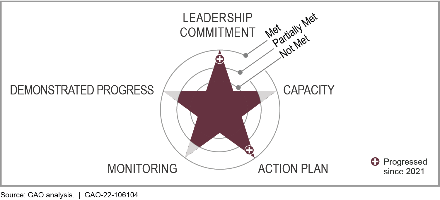 Since GAO last reported on the high-risk status of the Bureau of Indian Education's (BIE) administration of schools for American Indian students in March 2021, the agency has fully met two of the five criteria for removal from the High-Risk List. Specifically, BIE has fully met the criteria for leadership commitment and having an action plan. Senior leaders have demonstrated a strong commitment to addressing the issues GAO identified and have provided continued support to resolve these management weaknesses. In addition, BIE and other offices within the Department of the Interior (Interior) have developed action plans to address a range of management challenges including a September 2021 comprehensive, long-term capital asset plan to guide its school construction efforts and a January 2022 plan to build schools' capacity to ensure building safety, such as maintaining fire alarm and sprinkler systems.