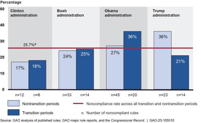 The Congressional Review Act requires agencies to submit rules to Congress and GAO with 60 days for review. Average noncompliance with this requirement during the Trump administration was comparable to prior administrations.