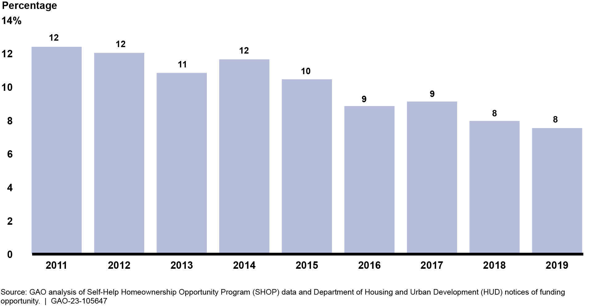 GAO analysis of SHOP and market data illustrates this reduction in SHOP's purchasing power due to the increases in market prices. For example, the median sales price of SHOP-assisted units increased from about $120,000 in 2011 to nearly $200,000 in 2019. SHOP's per-unit spending limit of $15,000 during this period would have contributed about 12 percent toward the median sales price in 2011 but only 8 percent in 2019.