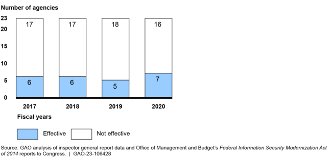To protect federal information and systems, the Federal Information Security Modernization Act of 2014 (FISMA) requires federal agencies to develop, document, and implement information security programs. Congress included a provision in FISMA for GAO to periodically report on agencies’ implementation of the act. In March 2022, we reported on the information security programs of 23 federal civilian agencies, including annually required program reviews to be conducted by agency inspectors general (IG). Among other things, we noted that IGs determined that 16 (or 70 percent) of the 23 agencies had ineffective programs for fiscal year 2020.